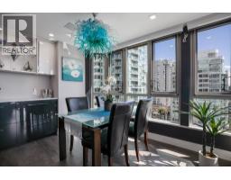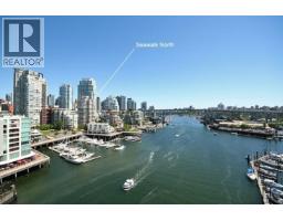Chic corner unit, water view, steps from Seawall. 2 beds, 1 bath. Bright SE living/dining, floor-to-ceiling windows. Designer show home, seamless cabinetry, hidden storage, Chihuly-style chandelier. Fully furnished living room, leather sectional, 4K smart TV, motorized shades, 7-speaker Kef audio. Smart home controls, portable AC, master bed, Queen bed, 42" TV. 2nd bedroom, Queen bed, dedicated desk, ergonomic sit/stand desk. Gourmet kitchen, island, Miele, Bosch, Marvel appliances, quartz countertops, modern cabinets. Private patio, water views. Spa-inspired bathroom, double sinks, walk-in shower, sky window, rain shower, hand shower, Nu-Heat floors, storage. Storage locker, garbage chute on the same floor. Concierge, gym. Quiet cul-de-sac by Granville Island Water Taxis. (id:12562)
