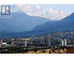 Luxurious 831sf 2 bedrooms condo features wide plank engineered wood floors, 8'8" ceilings, lovely north facing views of Metrotown and North Shore mountains, and high quality fixtures used throughout. This unit has a very functional floor plan with almost no hallways at all which maximizes space usage for each room. Through the foyer you enter the corner living dining area with two sides of windows, access to the view balcony, and the very high end open kitchen. This kitchen comes with wood veneer cabinetry with open glass display shelving, serving counter with breakfast bar, soft close drawers and doors, stone countertop, and white marble backsplash. At the foyer is the 3 pcs 2nd bathroom with shower stall, and the insuite laundry closet. Rent includes one parking stall. (id:12562)